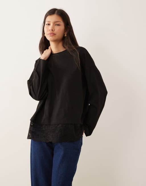 ASOS DESIGN - Sort overdel med lange ærmer og blondekant