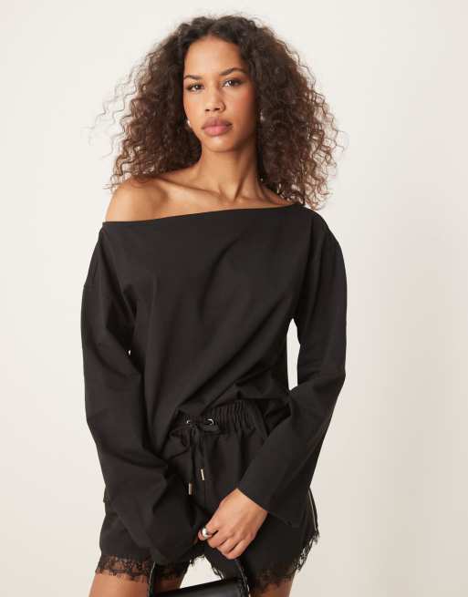 ASOS DESIGN - Sort oversized T-shirt med offshoulder-snit i kraftigt stof