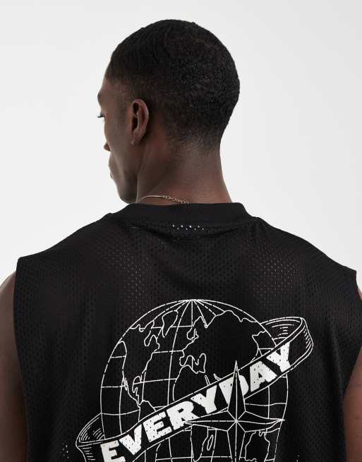 ASOS DESIGN - Sort oversized tanktop i airtex-stof med globegrafik