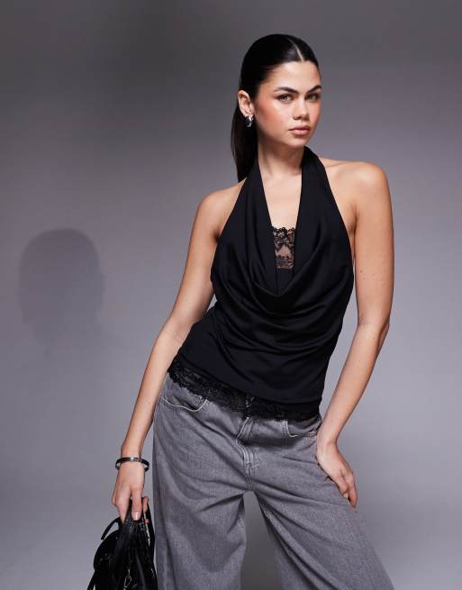 ASOS DESIGN - Sort peek a boo-top med vandfaldsudskæring og dobbeltlag i blondestof