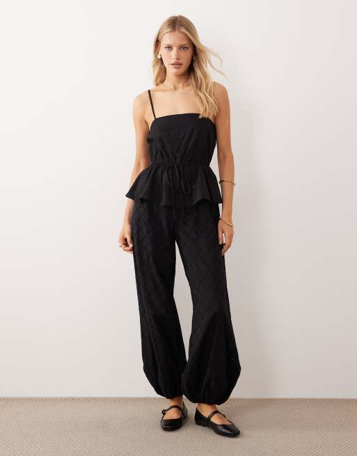 ASOS DESIGN - Sort peplum-jumpsuit med cami-stropper og broderede ben