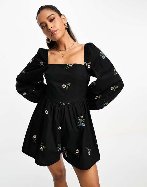 ASOS DESIGN - Sort playsuit med firkantet hals og broderier