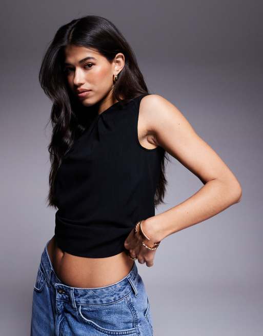 ASOS DESIGN - Sort ærmeløs top med rynkedetaljer i hørblanding - Del af sæt