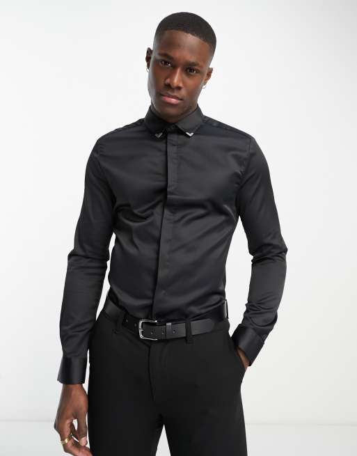 ASOS DESIGN - Sort satinskjorte med skinny fit og metaldetaljer på kraven