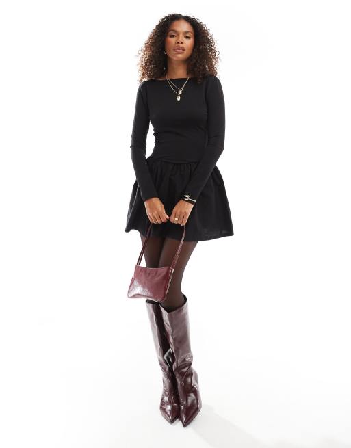 ASOS DESIGN - Sort skaterkjole med lav rygudskæring og lange ærmer i poplinblanding
