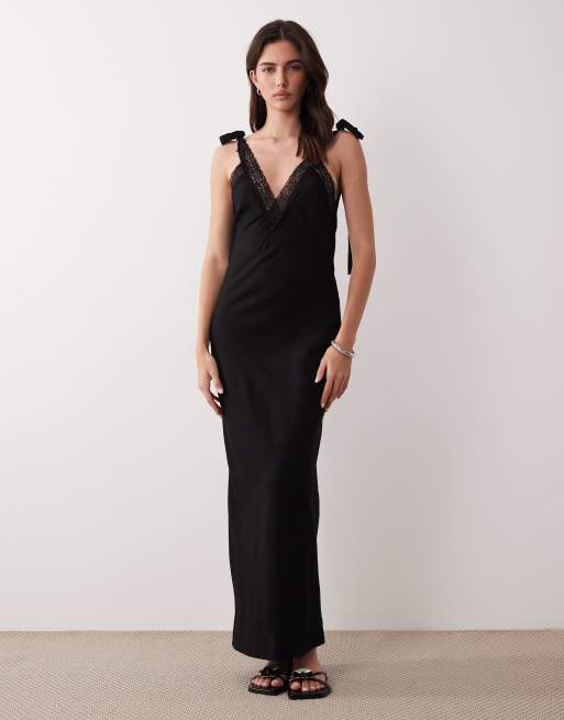 ASOS DESIGN - Sort slip-maxikjole med blondekanter og bindebånd