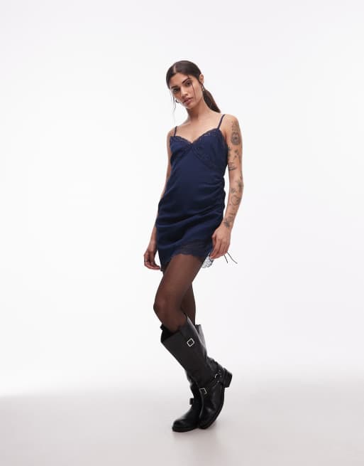 ASOS DESIGN - Sort slip-minikjole i satin med cami-stropper og blondedetaljer