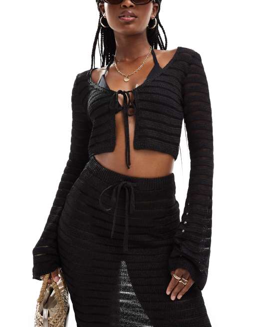 ASOS DESIGN - Sort strandtop i strik med striber og bindebånd fortil samt lange ærmer