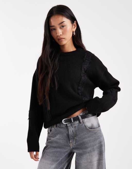 ASOS DESIGN - Sort striktrøje med brede ærmer og blondedetaljer