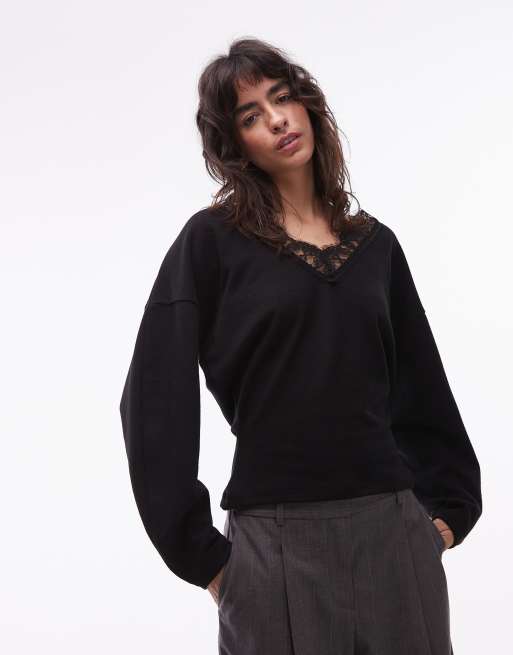 ASOS DESIGN - Sort superblød top med lange ærmer og blondekanter