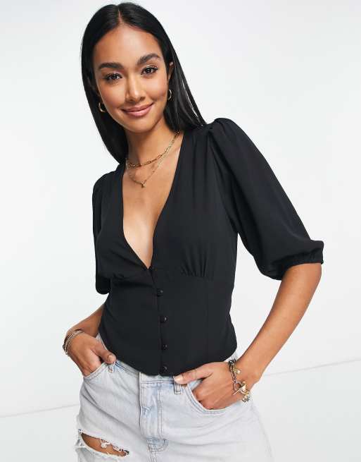 ASOS DESIGN - Sort tea-bluse med knapper foran samt voluminøse ærmer og bindedetalje bagpå