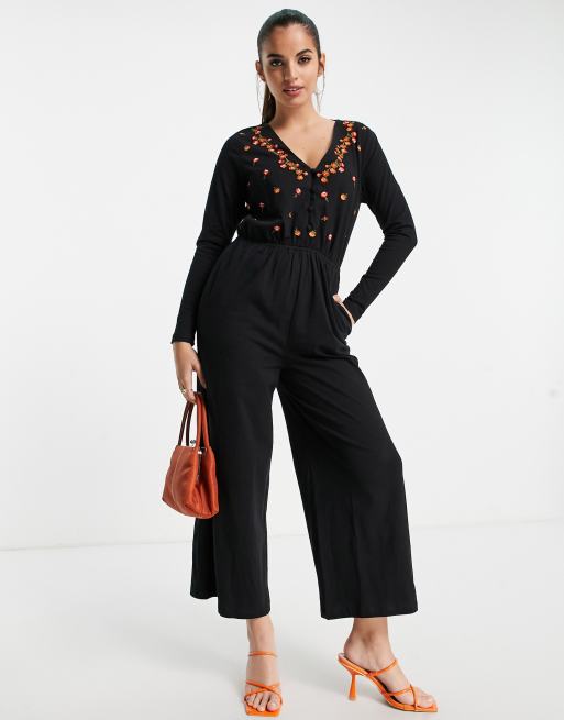 ASOS DESIGN - Sort tea-jumpsuit med broderi og knapper foran