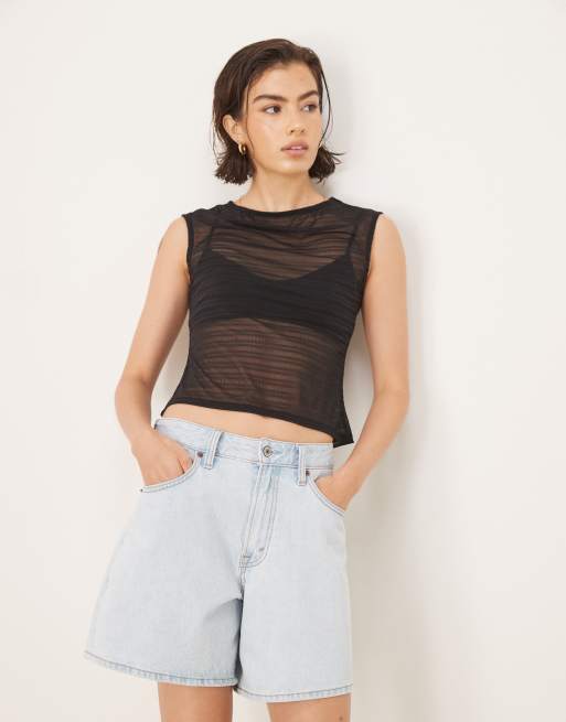 ASOS DESIGN - Sort top med bådudskæring, korte ærmer og rynker i mesh