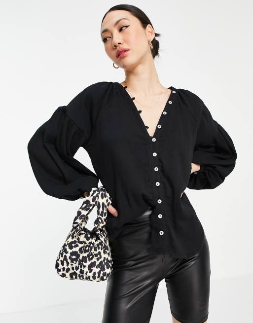 ASOS DESIGN - Sort top med muslingeknapper og voluminøse ærmer