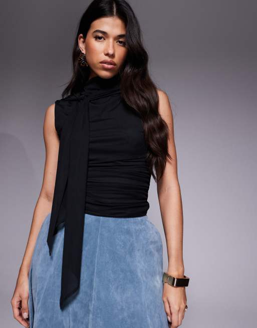 ASOS DESIGN - Sort top med tørklædedetalje og rynker i siden i mesh