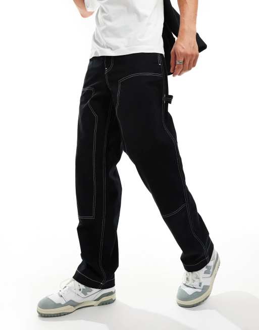 ASOS DESIGN - Sorte baggy arbejdsbukser med kontrastfarvede stikninger