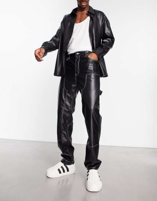 ASOS DESIGN - Sorte dad-jeans i læderlook med kontrastsyninger