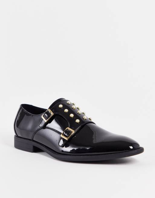 ASOS DESIGN - Sorte munkesko i lakeret imiteret læder med kunstperle-detalje