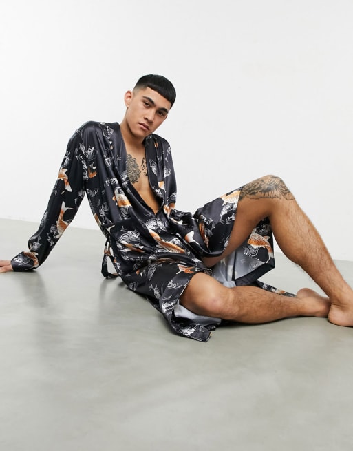 ASOS DESIGN - Sæt med badekåbe og boksershorts i satin med koi-print