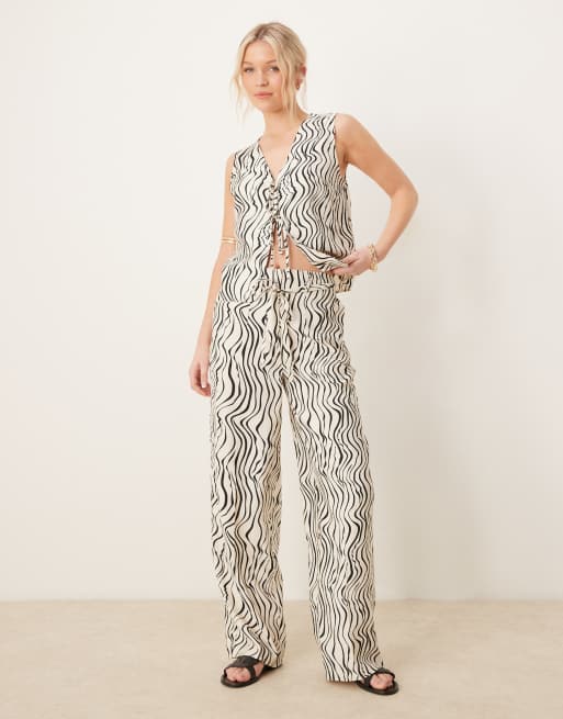 ASOS DESIGN - Sæt med top med bindebånd foran og bølget zebraprint og bukser i hørlook