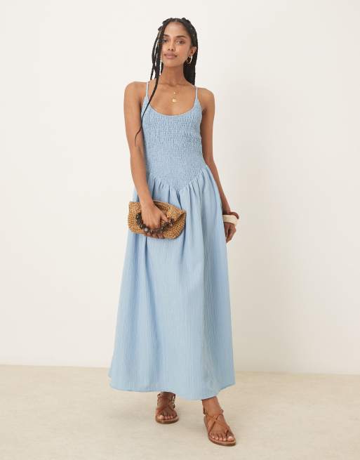 ASOS DESIGN - Stålblå maxikjole i krølstof med dyb og rund hals og krydsende stropper på ryggen