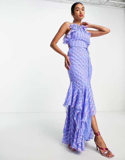 ASOS DESIGN - Stribet maxikjol med halterneck samt drapering og flæser og bindebånd i prikket satin