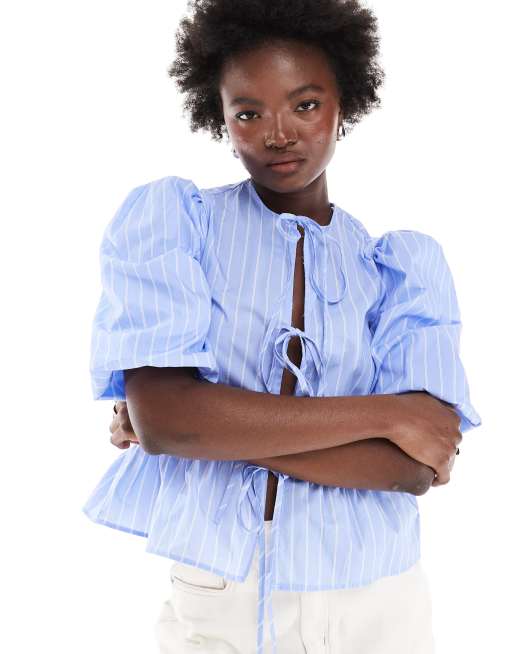 ASOS DESIGN - Stribet peplum-bluse med bindebånd foran i bomuldspoplin