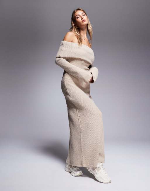 ASOS DESIGN - Strikket cremehvid bardot-maxikjole med brede ærmer