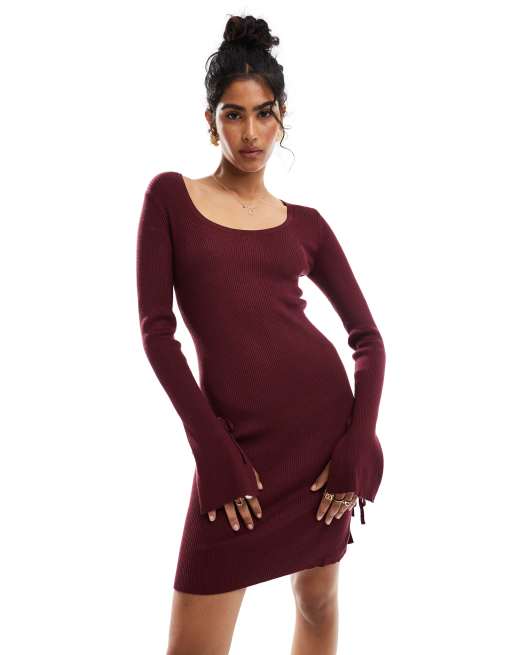 ASOS DESIGN - Strikket minikjole med dyb, rund hals og bindebånd i bordeaux