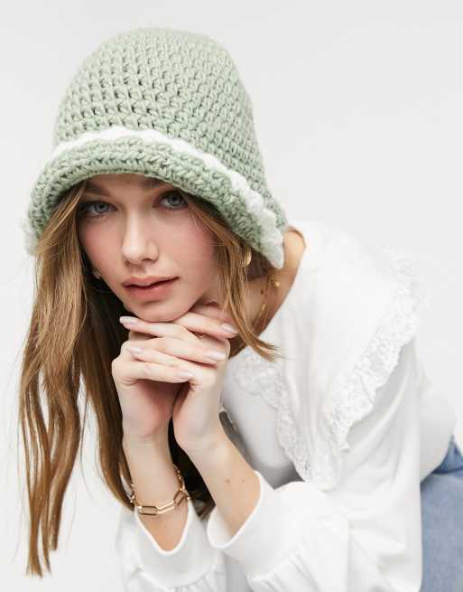 ASOS DESIGN - Strikket og hæklet bøllehat i cremefarve og salviegrøn