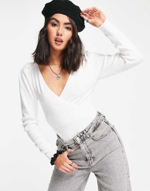 ASOS DESIGN - Strikket slå-om-bodystocking med voluminøse ærmer i cremehvid