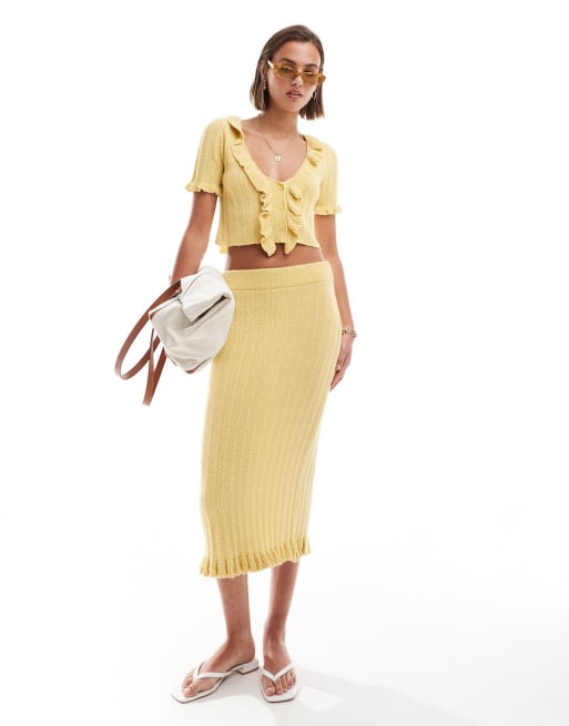 ASOS DESIGN - Strikket sæt med top og midaxi-nederdel med flæser i gul