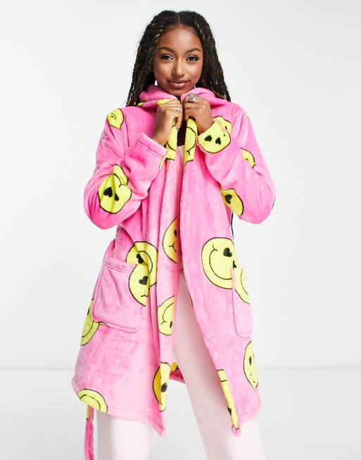 ASOS DESIGN - Superblød mini-badekåbe med smiley-print i lyserødt fleece