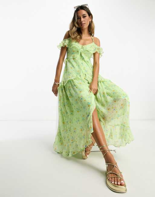ASOS DESIGN - Tea-midikjole i chiffon med flæser og V-hals samt knapper og småblomstret print