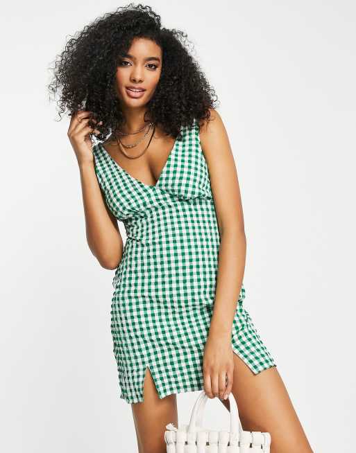 ASOS DESIGN - Tekstureret slip-minikjole med V-hals og grønne gingham-tern