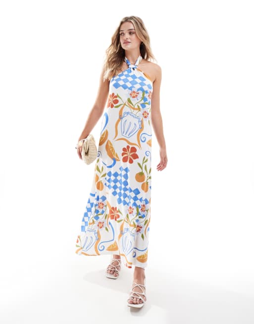ASOS DESIGN - Trapez-formet midikjole med halterneck med knudedetalje og postkortprint