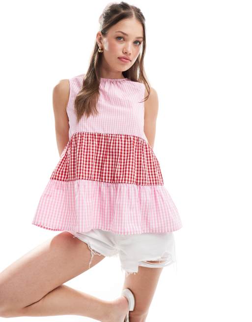 ASOS DESIGN - Trapez-top i splejset rødt/lyserødt gingham-tern