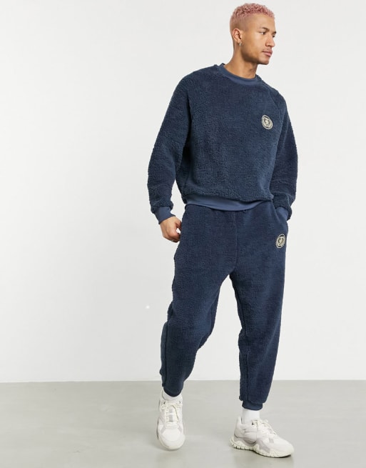 ASOS DESIGN - Træningssæt i marineblåt imiteret lammeskind med broderi på brystet