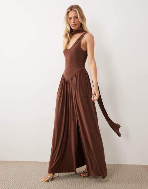 ASOS DESIGN - Tætsiddende chokoladebrun maxikjole med tørklædedetalje
