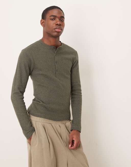 ASOS DESIGN - Tætsiddende og kakifarvet sweatshirt i børstet ribstrik med firkantet pasform og Henley-hals