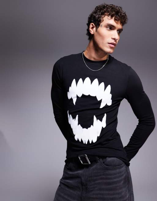ASOS DESIGN - Tætsiddende og sort T-shirt med lange ærmer og Halloween-print foran