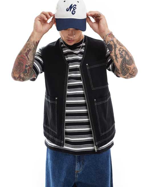 ASOS DESIGN - Utility-vest i forvasket sort med kontrastsyninger