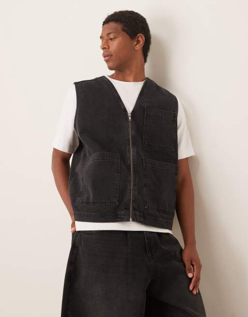 ASOS DESIGN - Vasket sort denimvest med påsyede lommer - Del af sæt