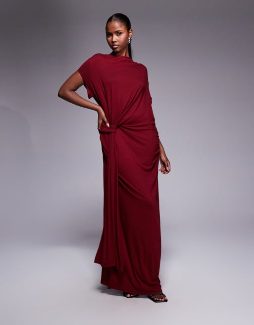 ASOS DESIGN - Vinrød midaxi-kjole med drapering og afkortede ærmer