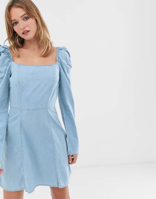 Demin minikjole med malkepige halsudskæring i letvasket blå fra ASOS DESIGN