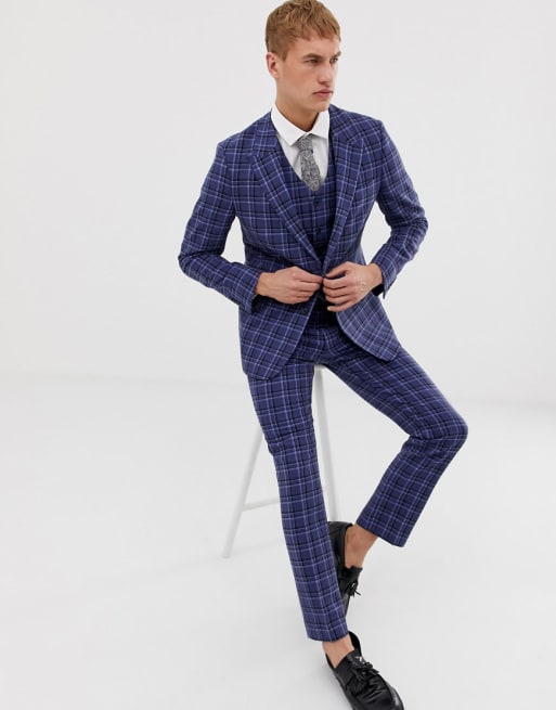 Jakkesæt med smal pasform og ton-i-ton blå tern i uldmix fra ASOS DESIGN