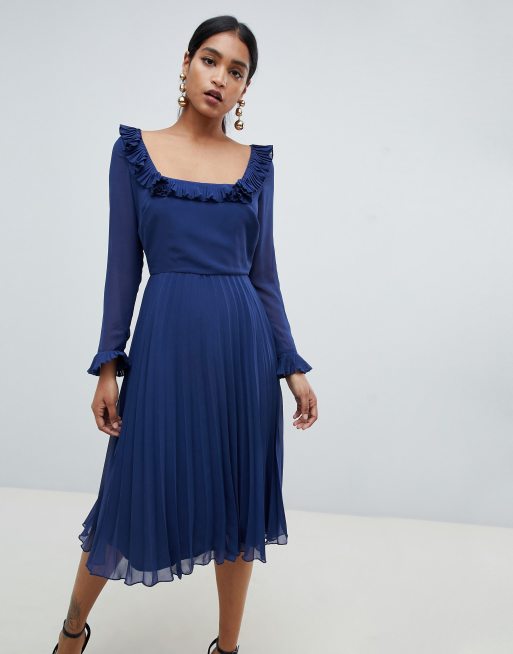 Plisseret midikjole med flæser, lange ærmer og firkantet hals fra ASOS DESIGN