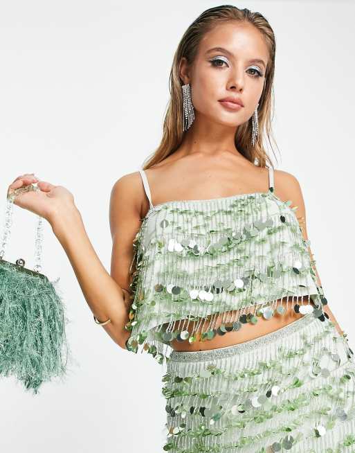ASOS EDITION - Cami-top med paillette frynser i salviegrøn