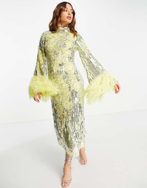 ASOS EDITION - Citrongul midikjole med blomsterpailletter og perler samt tætsiddende kanter med fjer