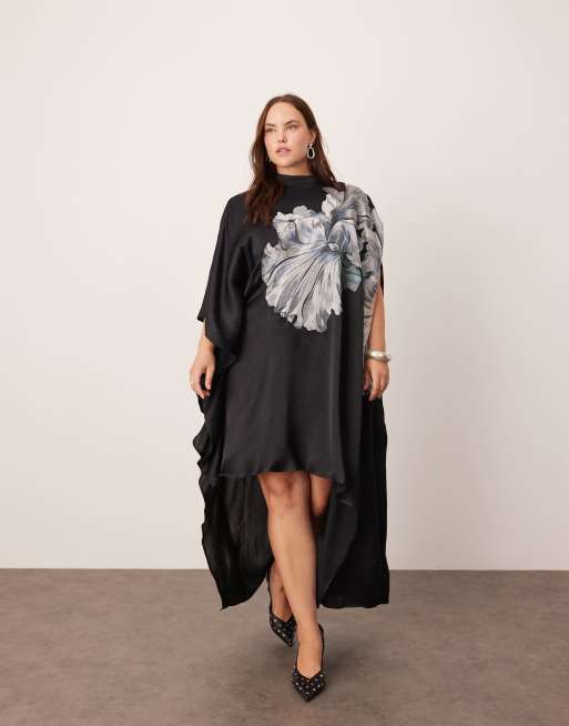 ASOS EDITION Curve - Sort midikjole med høj hals, asymmetrisk kant og oversized, broderet blomstermønster